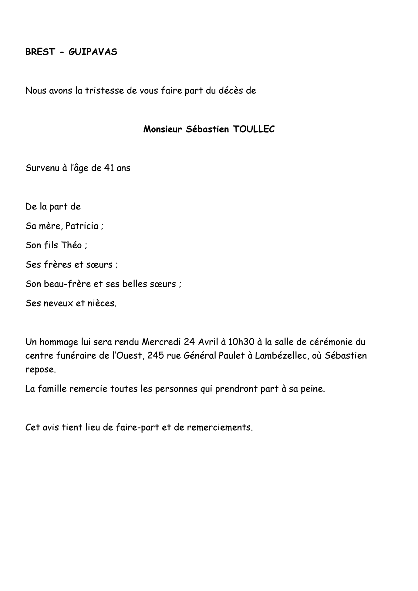 Cet espace « condoléances » est dédié à la mémoire de Monsieur Sébastien TOULLEC.