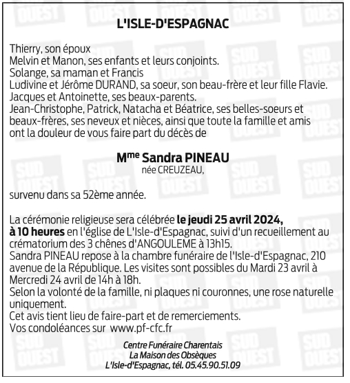 Cet espace « condoléances » est dédié à la mémoire de Madame Sandra PINEAU née CREUZEAU.