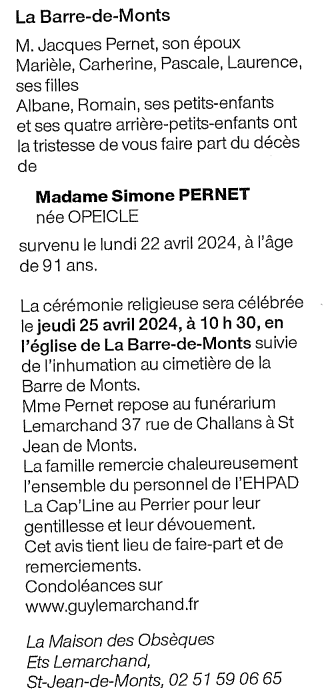 de Madame Simone PERNET née OPEICLE