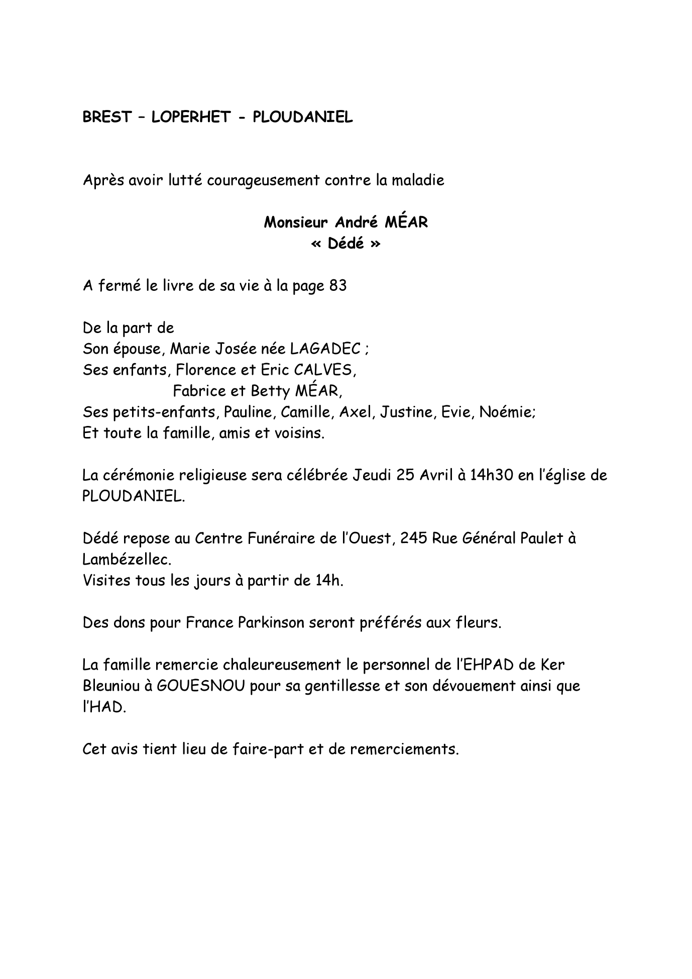 Cet espace « condoléances » est dédié à la mémoire de Monsieur André MÉAR.
