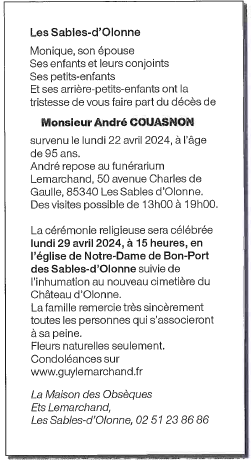 Cet espace « condoléances » est dédié à la mémoire de Monsieur André COUASNON.