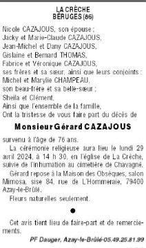 Cet espace « condoléances » est dédié à la mémoire de Monsieur Gérard CAZAJOUS.