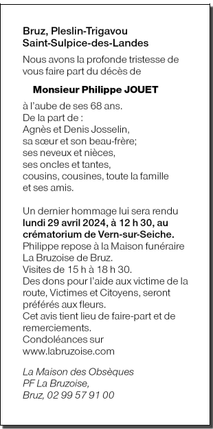 Cet espace « condoléances » est dédié à la mémoire de Monsieur Philippe JOUET.