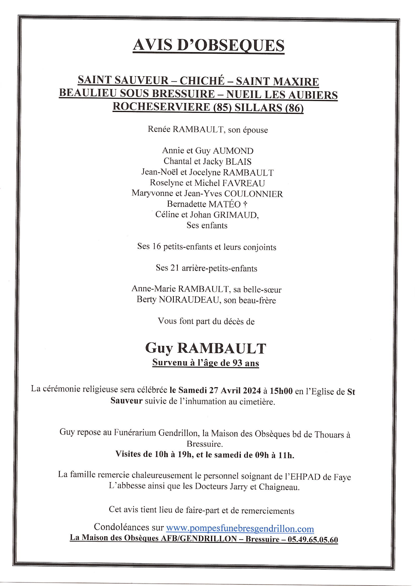Cet espace « condoléances » est dédié à la mémoire de Monsieur Guy RAMBAULT.