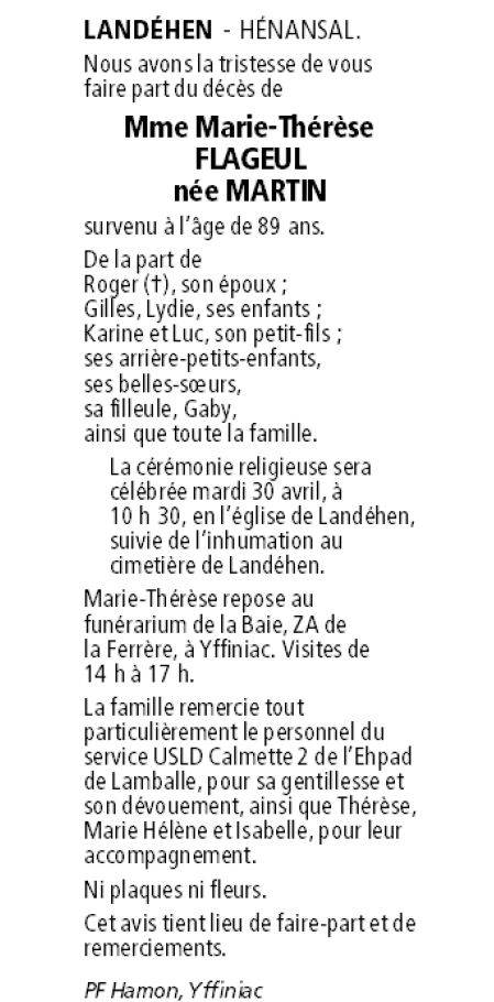 de Madame Marie-Thérèse FLAGEUL née MARTIN