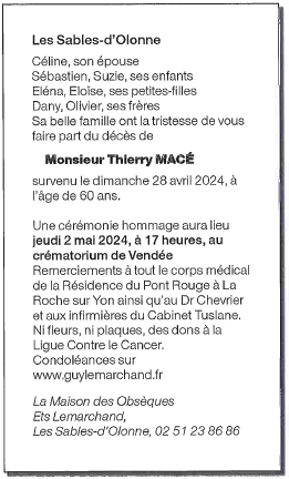 Cet espace « condoléances » est dédié à la mémoire de Monsieur Thierry MACÉ.
