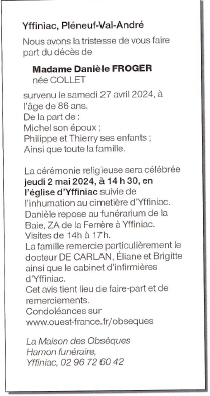 Décédée à Yffiniac (22120) le samedi 27 avril 2024