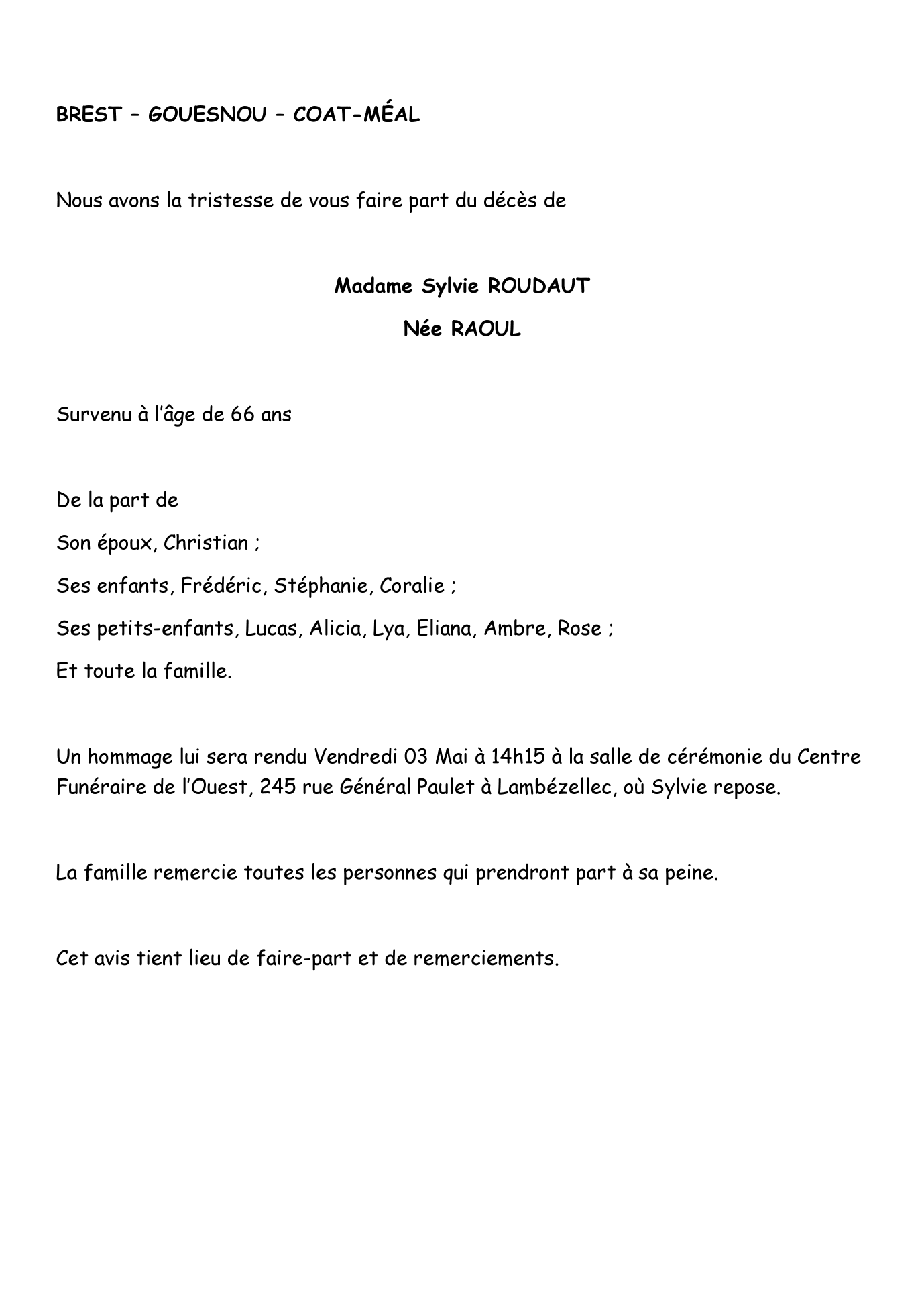 Cet espace « condoléances » est dédié à la mémoire de Madame Sylvie ROUDAUT née RAOUL.