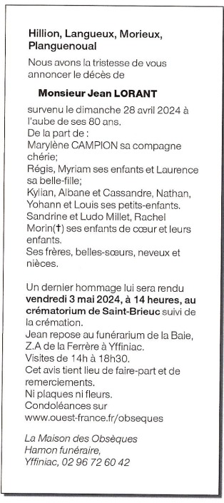 Décédé à Hillion (22120) le dimanche 28 avril 2024