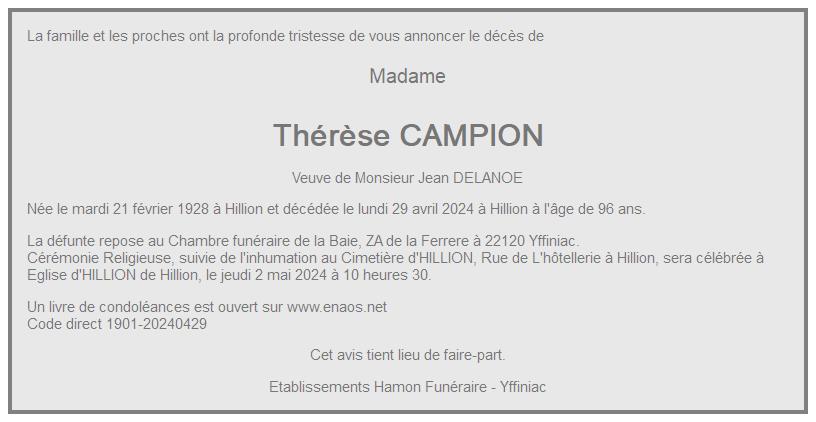 Cet espace « condoléances » est dédié à la mémoire de Madame Thérèse DELANOE née CAMPION.