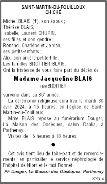 Cet espace « condoléances » est dédié à la mémoire de Madame Jacqueline BLAIS née BROTTIER.