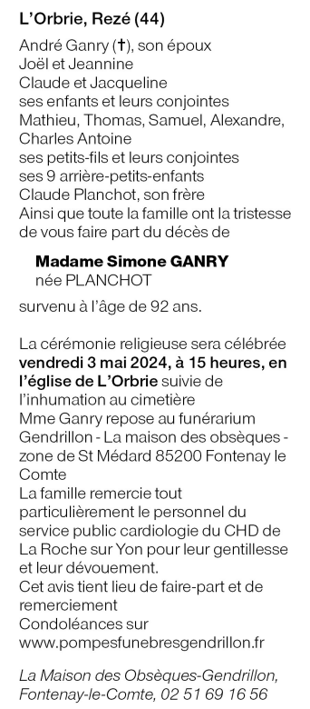 Cet espace « condoléances » est dédié à la mémoire de Madame Simone GANRY née PLANCHOT.
