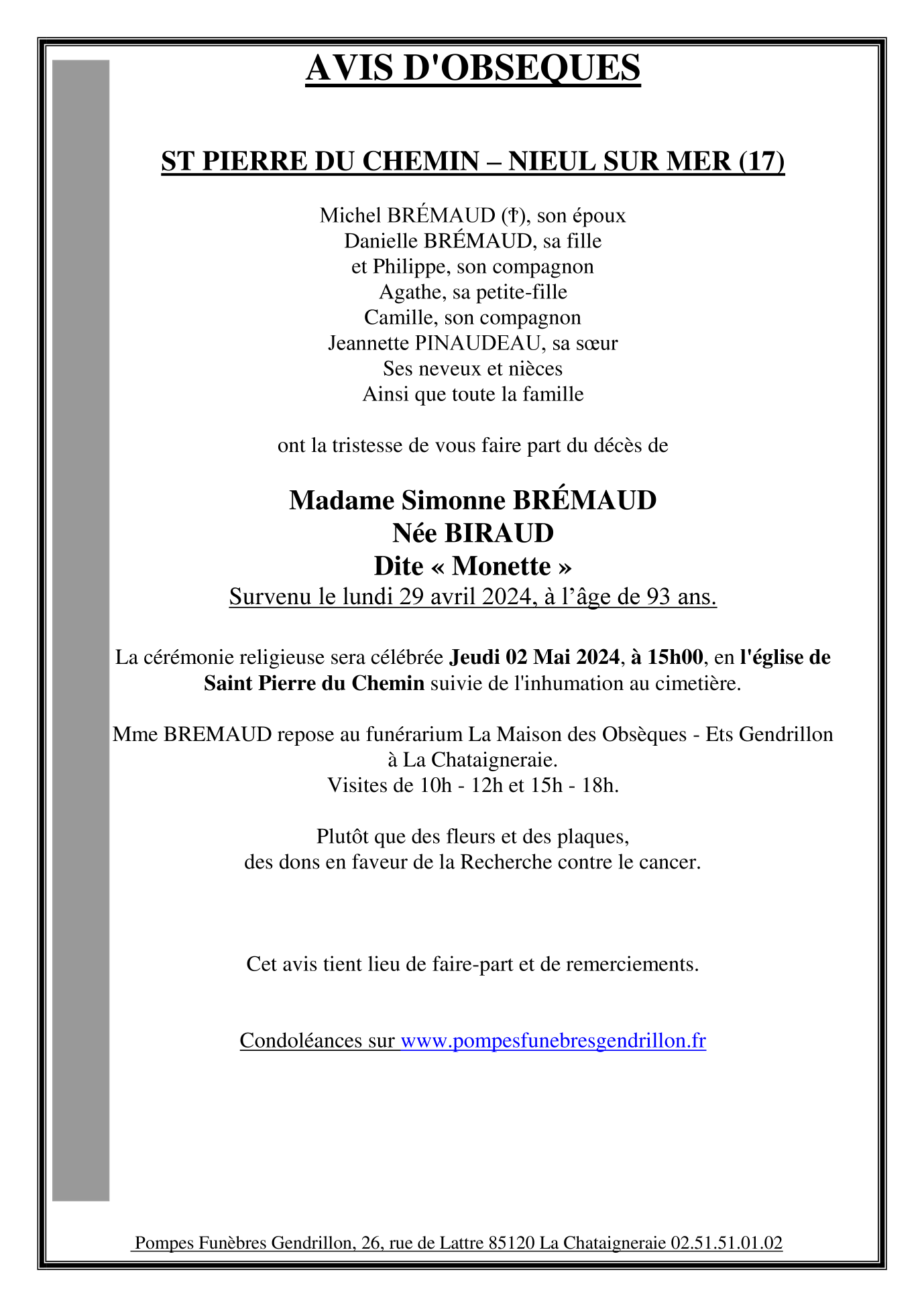 Cet espace « condoléances » est dédié à la mémoire de Madame Monette BIRAUD.