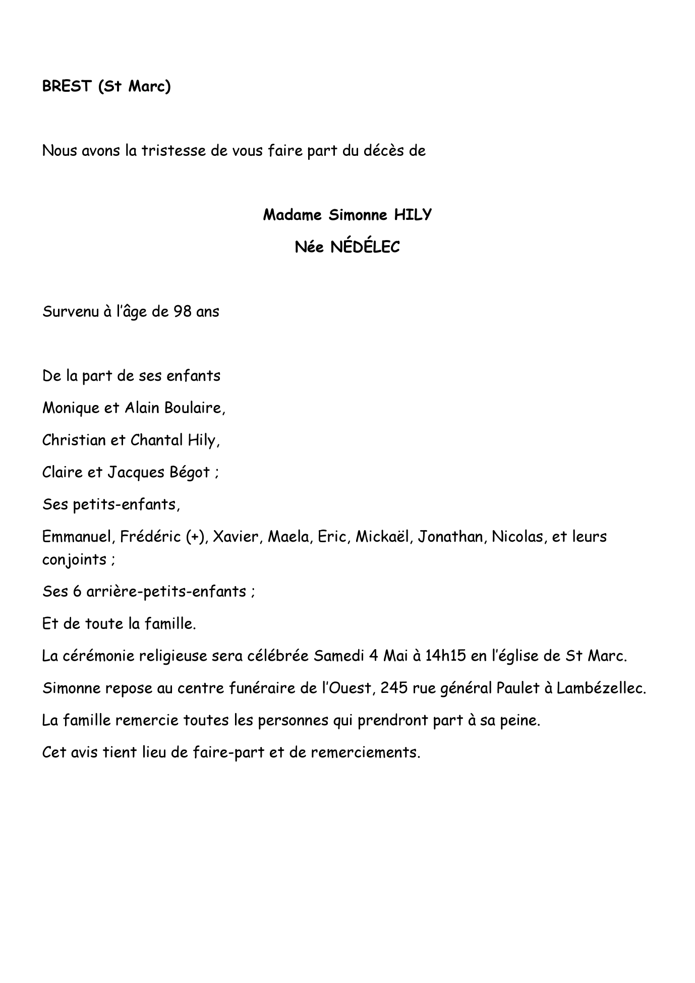 Cet espace « condoléances » est dédié à la mémoire de Madame Simonne Hily née NÉDÉLEC.