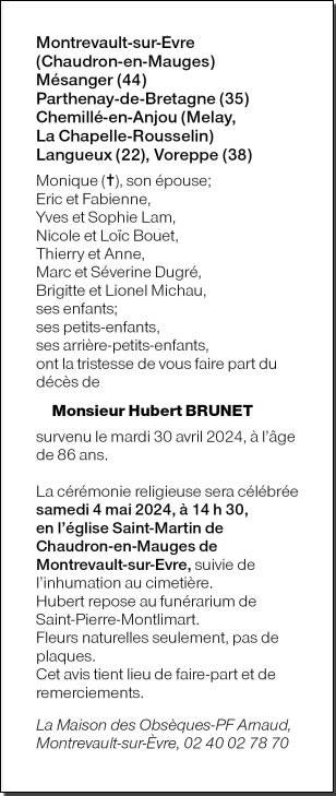 Avis d'obsèques de Monsieur HUBERT BRUNET