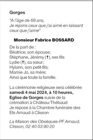 Décédé à Gorges (44190) le mercredi 1 mai 2024