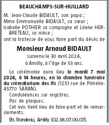 Cet espace « condoléances » est dédié à la mémoire de Monsieur Arnaud BIDAULT.