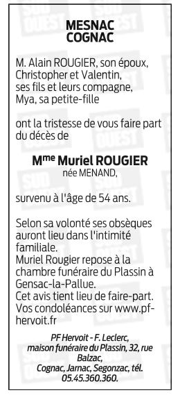 Cet espace « condoléances » est dédié à la mémoire de Madame Muriel ROUGIER.