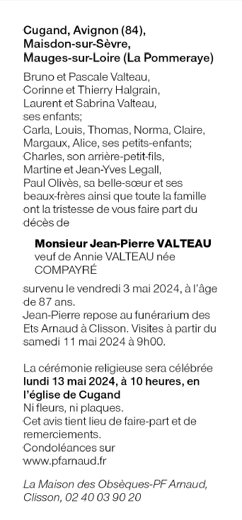 Cet espace « condoléances » est dédié à la mémoire de Monsieur Jean-Pierre VALTEAU.