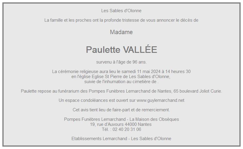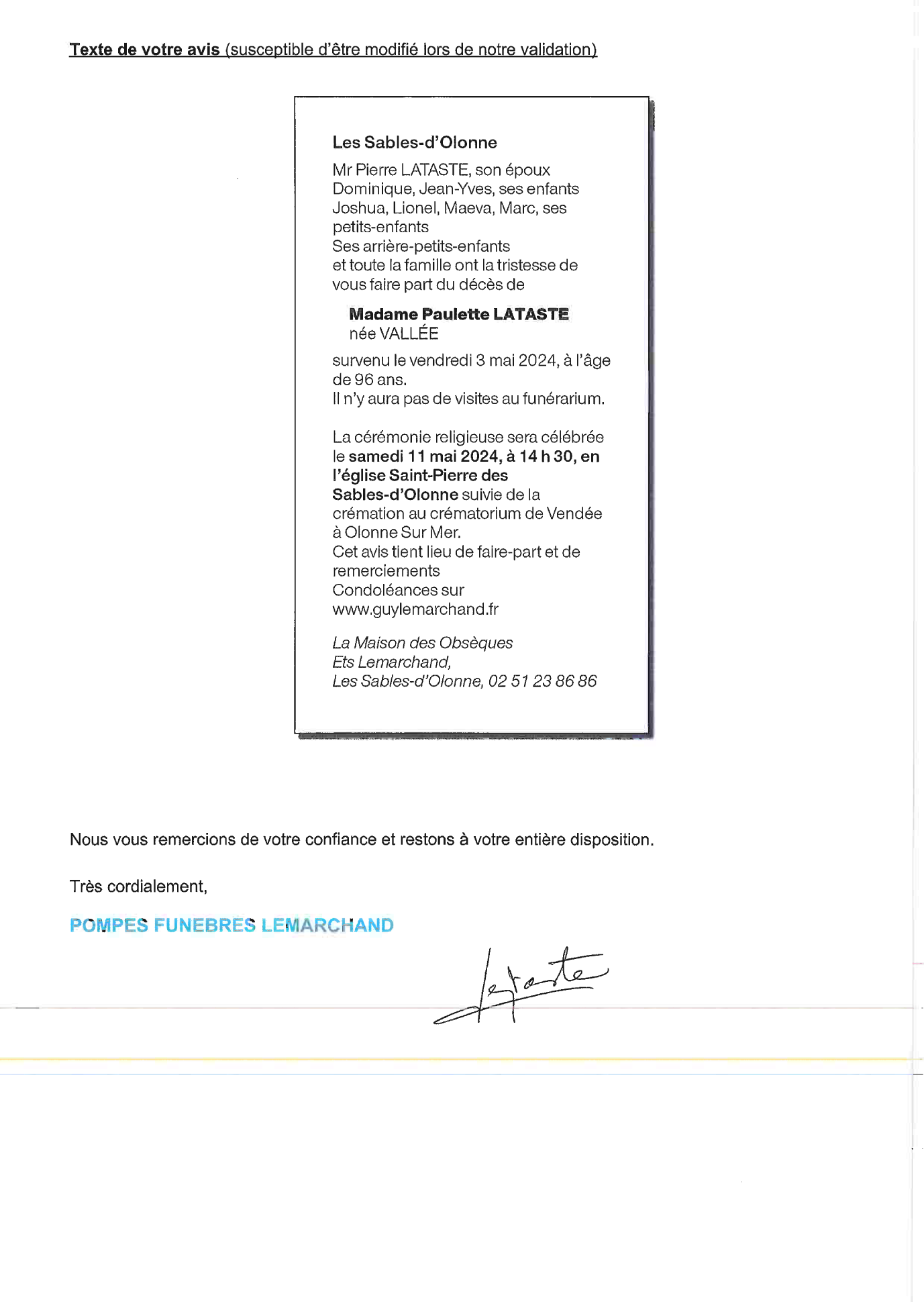 Cet espace « condoléances » est dédié à la mémoire de Madame Paulette LATASTE née VALLÉE.