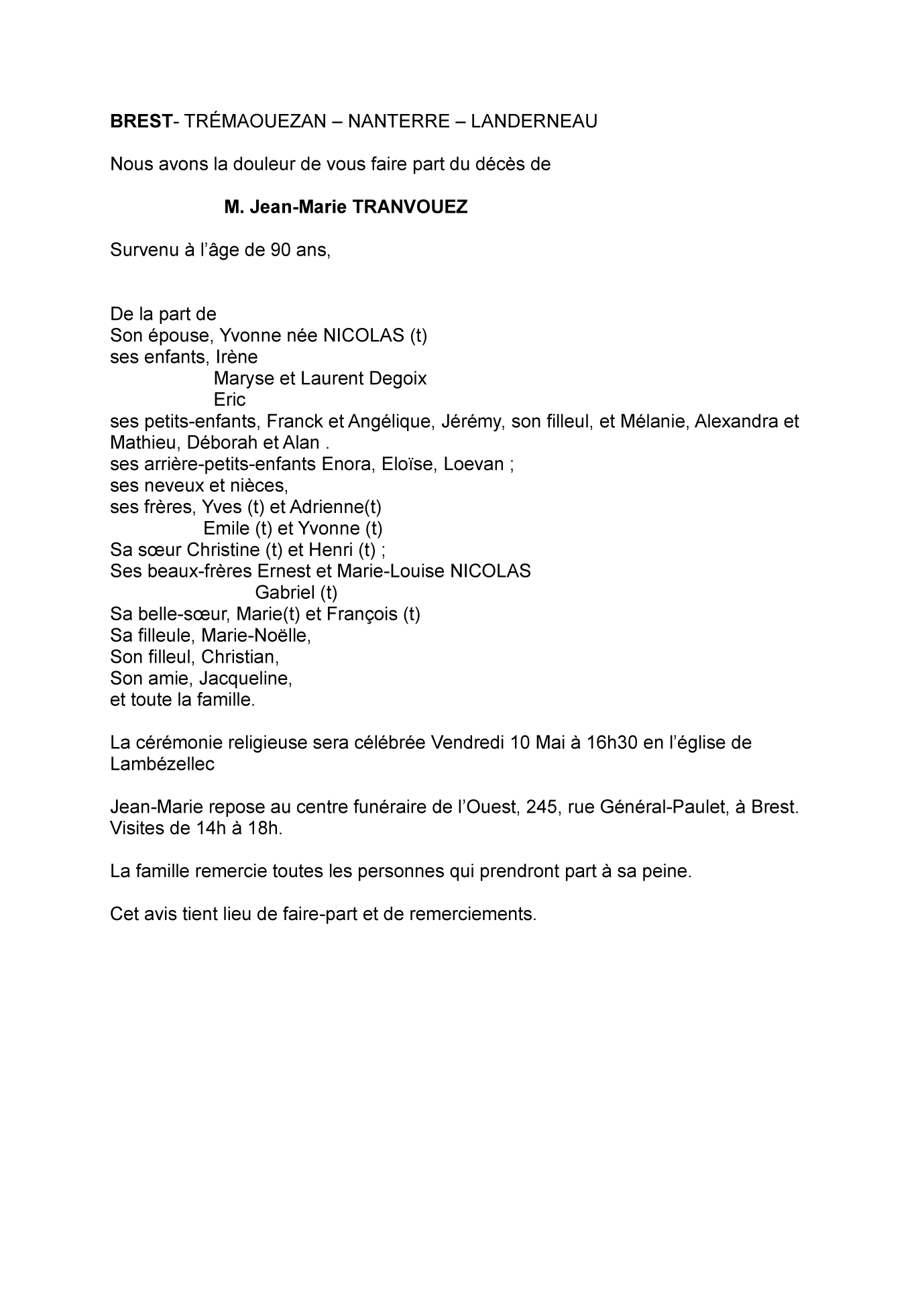 Cet espace « condoléances » est dédié à la mémoire de Monsieur Jean-Marie TRANVOUEZ.