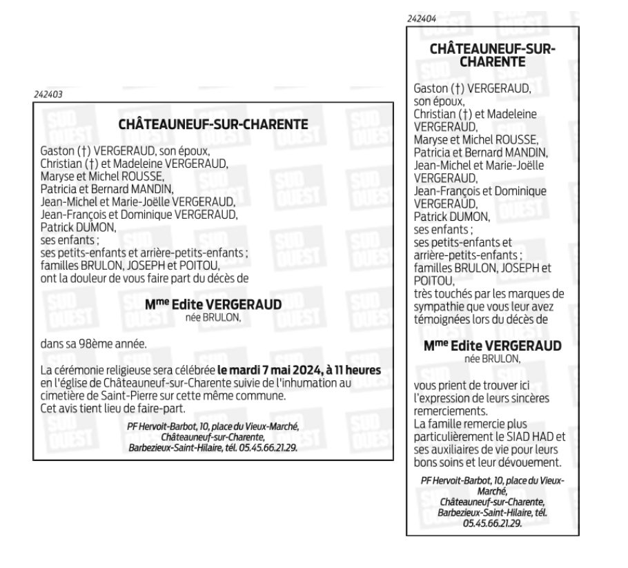 de Madame Edite VERGERAUD née BRULON