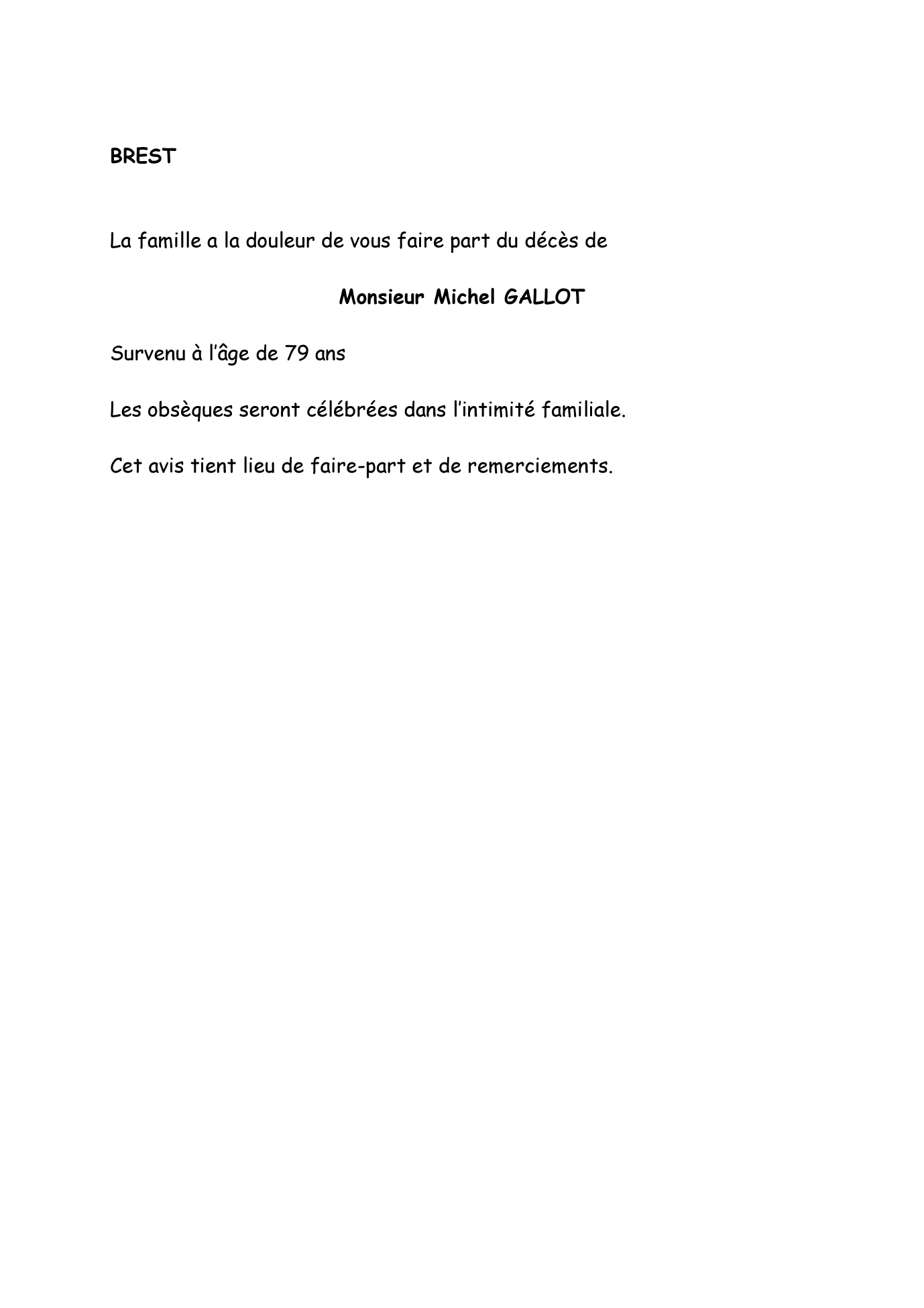 Cet espace « condoléances » est dédié à la mémoire de Monsieur Michel GALLOT.