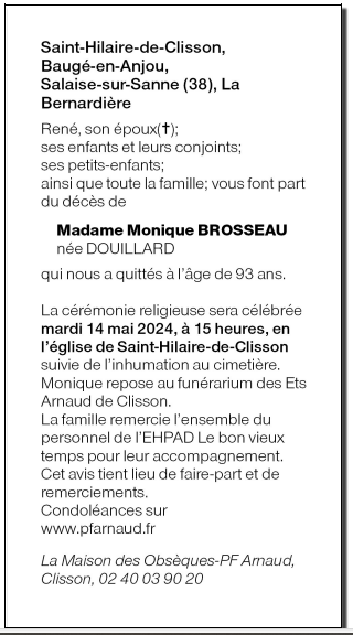 Cet espace « condoléances » est dédié à la mémoire de Madame Monique BROSSEAU née DOUILLARD.