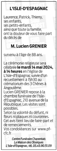 Cet espace « condoléances » est dédié à la mémoire de Monsieur Lucien GRENIER.