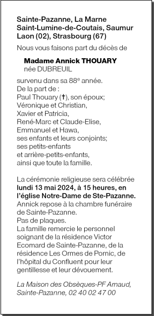 Cet espace « condoléances » est dédié à la mémoire de Madame Annick THOUARY née DUBREUIL.