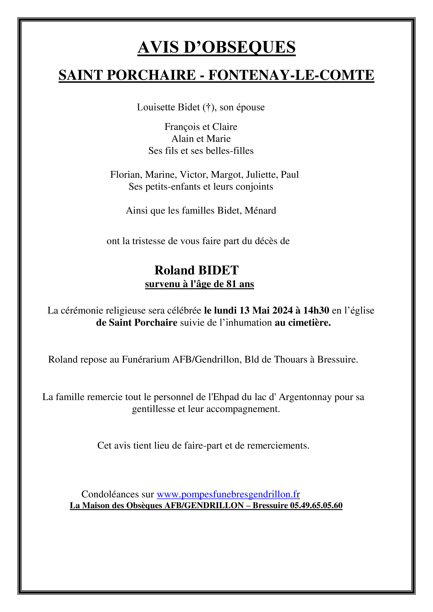 Cet espace « condoléances » est dédié à la mémoire de Monsieur Roland BIDET.