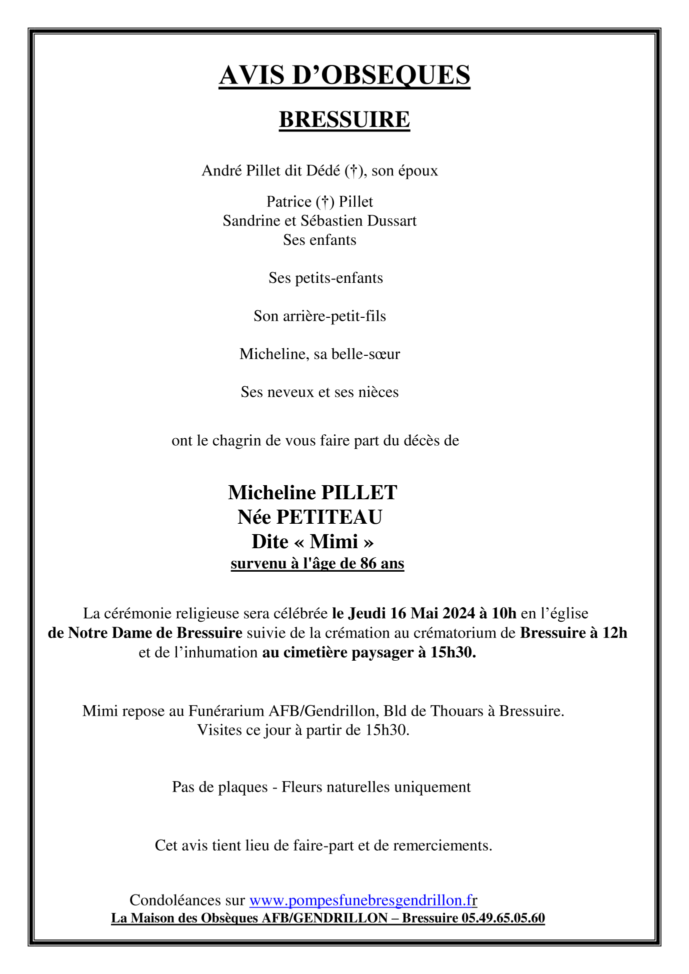 Cet espace « condoléances » est dédié à la mémoire de Madame Micheline PILLET née PETITEAU.