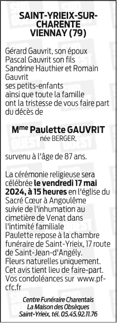 de Madame Paulette GAUVRIT née BERGER