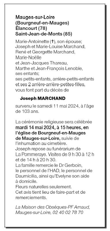 Cet espace « condoléances » est dédié à la mémoire de Monsieur Joseph MARCHAND.