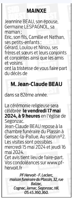 Cet espace « condoléances » est dédié à la mémoire de Monsieur Jean-Claude BEAU.