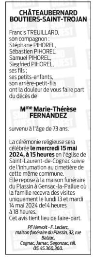 Décédée à Châteaubernard (16100) le vendredi 10 mai 2024
