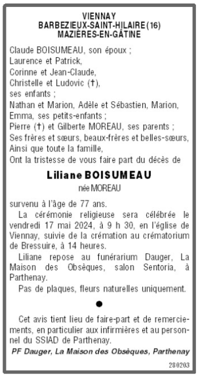 de Madame Liliane BOISUMEAU née MOREAU