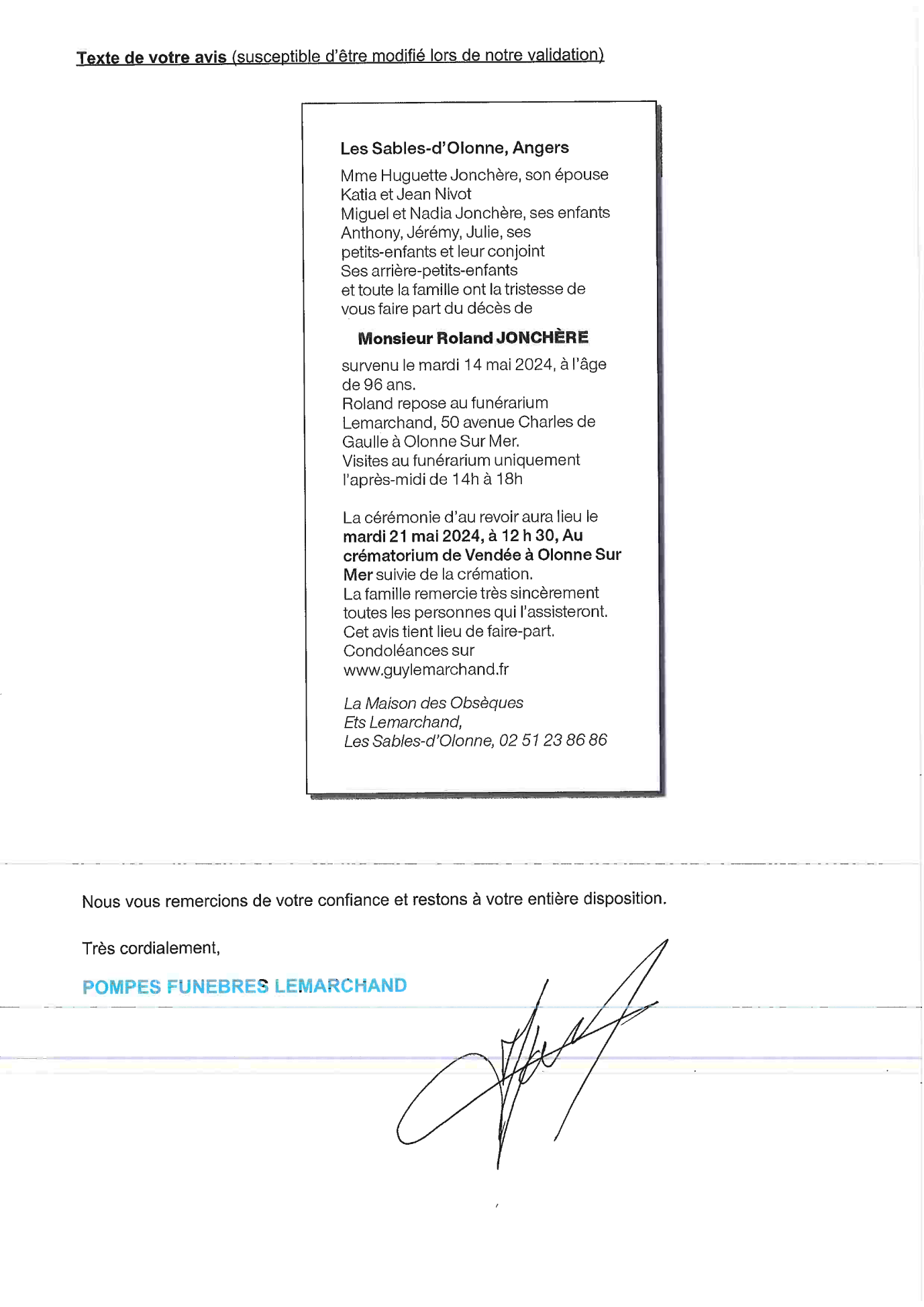 Cet espace « condoléances » est dédié à la mémoire de Monsieur Roland JONCHÉRE.