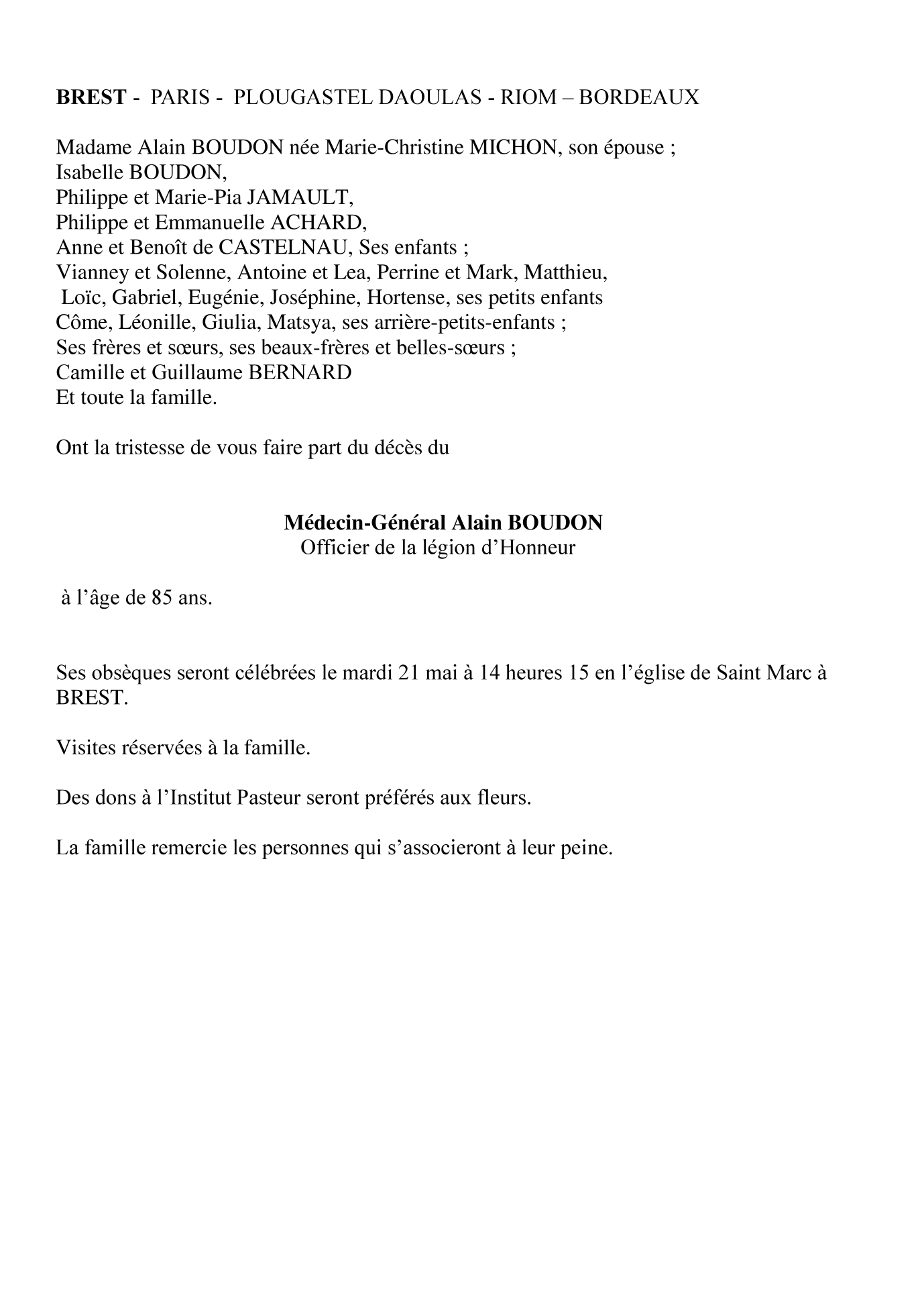 Cet espace « condoléances » est dédié à la mémoire de Monsieur LE MÉDECIN GÉNÉRAL BOUDON Alain.