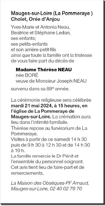 Cet espace « condoléances » est dédié à la mémoire de Madame Thérèse NEAU née BORÉ.
