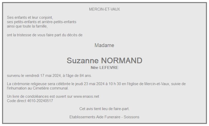 Cet espace « condoléances » est dédié à la mémoire de Madame Suzanne NORMAND née LEFEVRE.