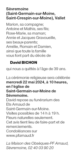 Cet espace « condoléances » est dédié à la mémoire de Monsieur David BICHON.