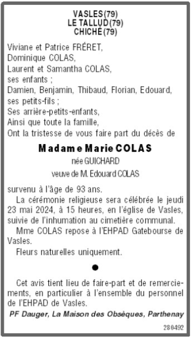 de Madame Marie COLAS née GUICHARD