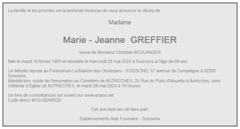 Cet espace « condoléances » est dédié à la mémoire de Madame Marie - Jeanne BOULANGER née GREFFIER.