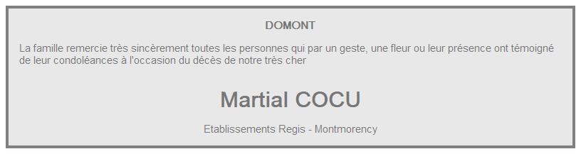 Cet espace « condoléances » est dédié à la mémoire de Monsieur Martial COCU.