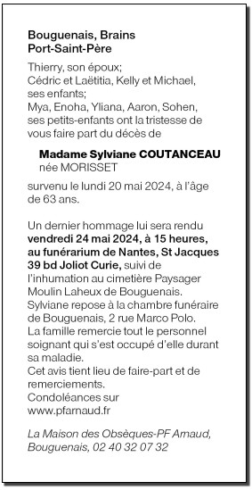Cet espace « condoléances » est dédié à la mémoire de Madame Sylviane COUTANCEAU née MORISSET.