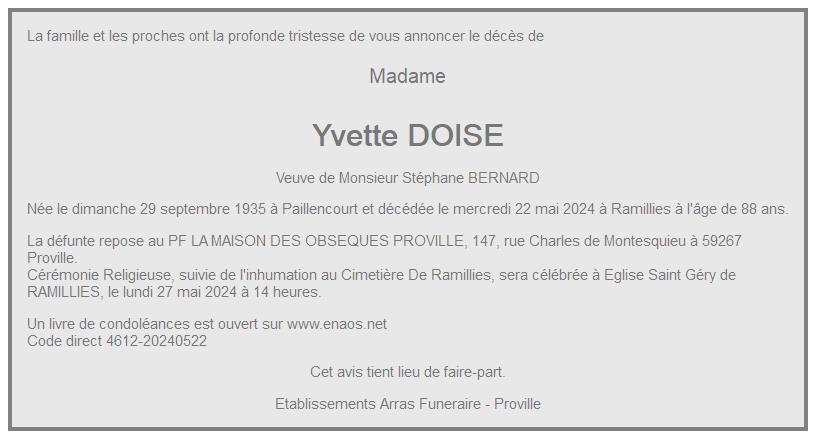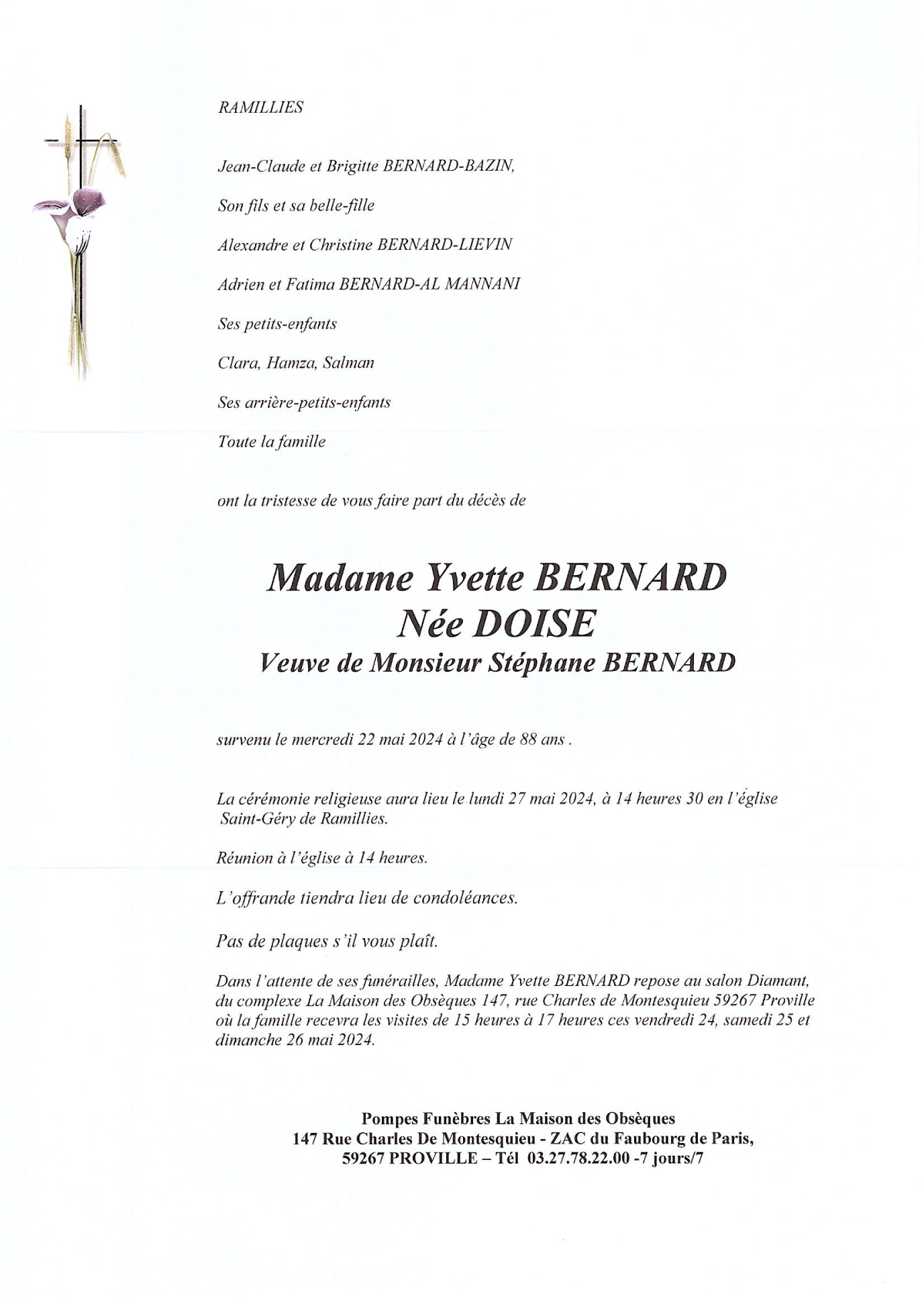Cet espace « condoléances » est dédié à la mémoire de Madame Yvette BERNARD née DOISE.