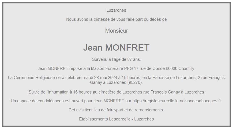 Cet espace « condoléances » est dédié à la mémoire de Monsieur Jean MONFRET.