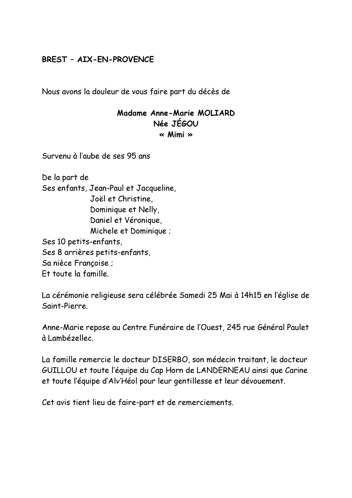 de Madame Anne-Marie MOLIARD née JÉGOU