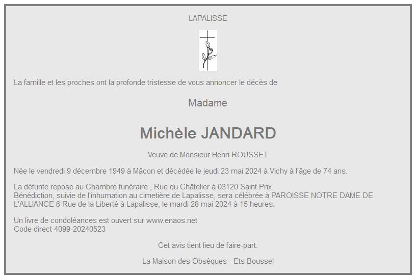 Cet espace « condoléances » est dédié à la mémoire de Madame Michèle ROUSSET née JANDARD.